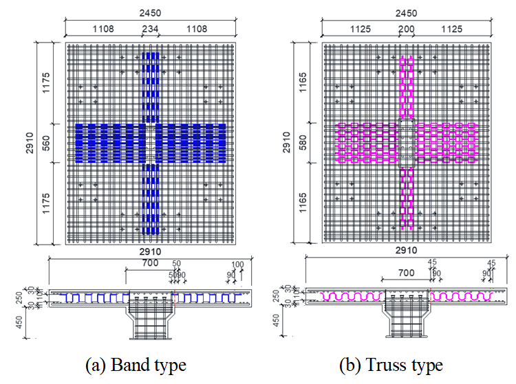 형상과 배근 방식에 따라 뚫림 전단 내력뿐 아니라 연성⋅에너지 소산 능력까지 현저히 달라질 가능성이 크지만, 이를 체계적으로 검증한 국내 연구는 아직