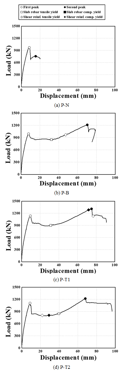 보강량을 절반으로 줄인 P-T2는 전체 하중–변위 거동이 P-T1과 유사했으나, 보강근이 주철근보다 먼저 항복하였다. 1차 피크 직후 보강근 변형률이
