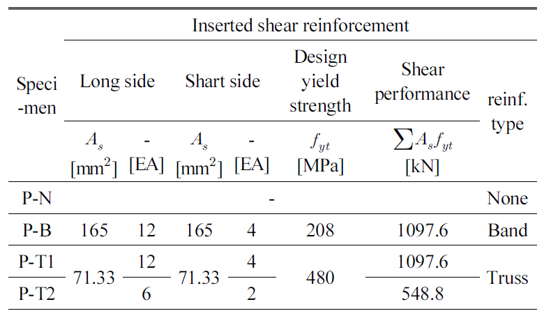 증진 한계를 나타내었다. 최근 삽입형 전단보강근과 같이 배근 시공성을 개선한 보강 기법이 제안되고 있으나, 설계식은 여전히 보강 형상에 관계없이 동일한