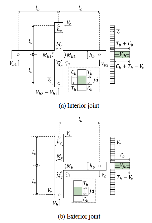Figs. 2(a)와 (b)는 각각 내부와 외부 접합부의 하중 전달 메커니즘을 개념적으로 나타낸 것이다. 접합부에서의 힘의 평형으로부터 내⋅외부 접합부가 경험하는 소요 전단강도($V_{jh}$,