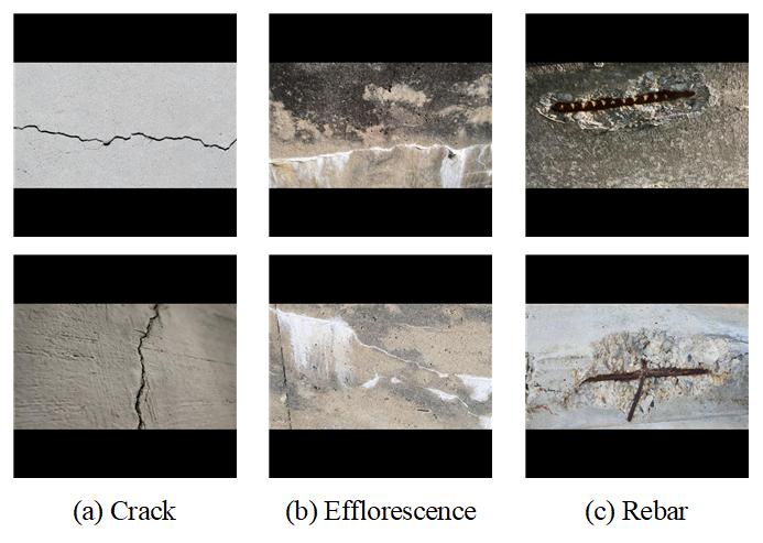 본 연구에서 사용한 콘크리트 손상 이미지 데이터는 균열(crack), 백태(efflorescence), 철근 노출(rebar)의 세 가지 유형으로