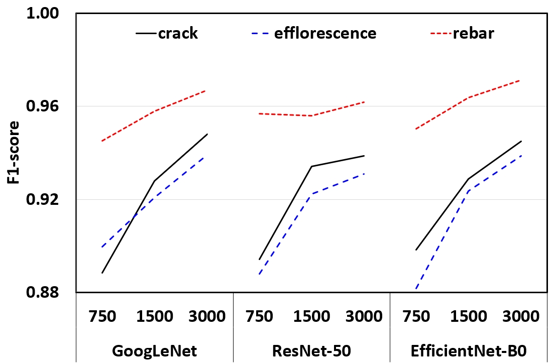 본 연구에서는 GoogLeNet, ResNet-50, EfficientNet-B0 세 가지 모델의 성능(Accuracy, F1-score), 해석성(Damage