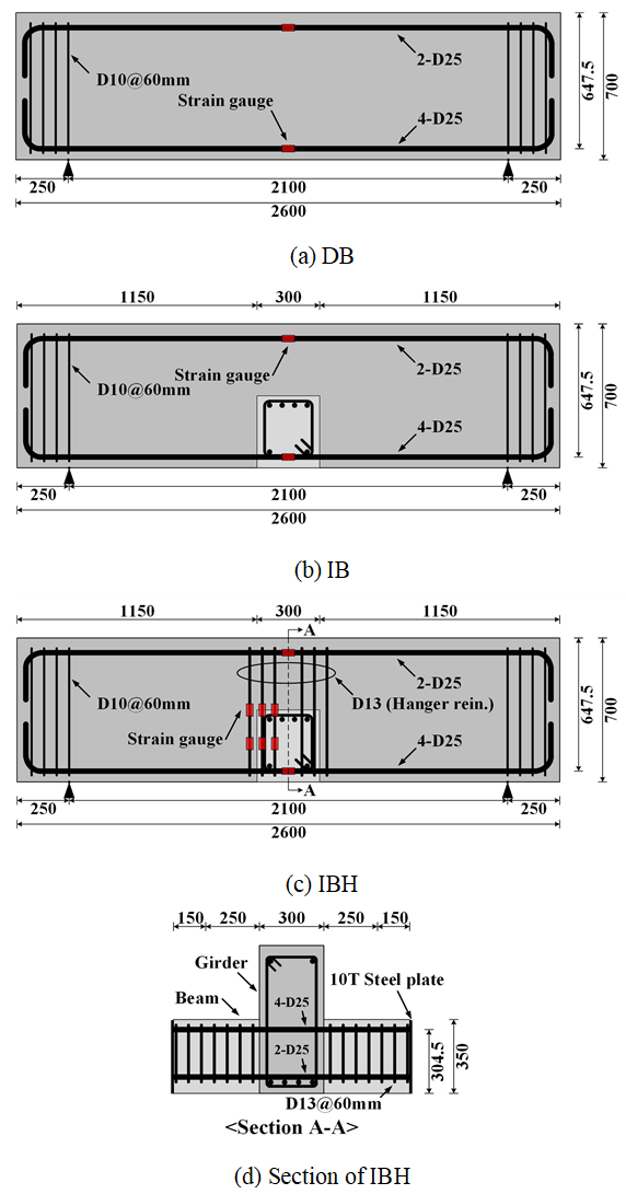 IBH 실험체는 보-보 접합부에 위치한 행거보강근의 영향을 평가하기 위하여 SD400 규격의 폐쇄형 D13 이형철근 6대를 배근하였다. 모든 실험체는