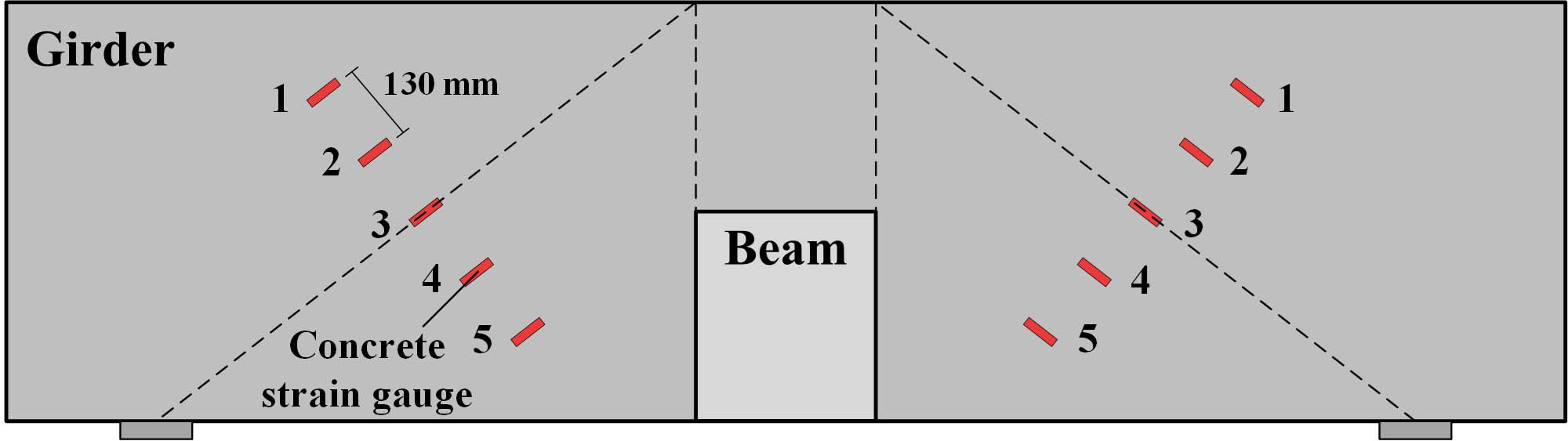 실험체의 큰 보 전단경간 영역의 변형률 및 압축대 변화를 평가하기 위하여 Fig. 3과 같이 실험체 측면에는 콘크리트용 스트레인 게이지 10개를 부착하였다. 실험체에 부착된 철근 스트레인 게이지의 위치는 Fig. 1에 나타내었다. 큰 보와 작은 보의 최대 휨 모멘트 발생 위치에서 인장 및 압축철근의 변형률 변화와 항복 여부를 판별하기 위하여 철근 스트레인 게이지를