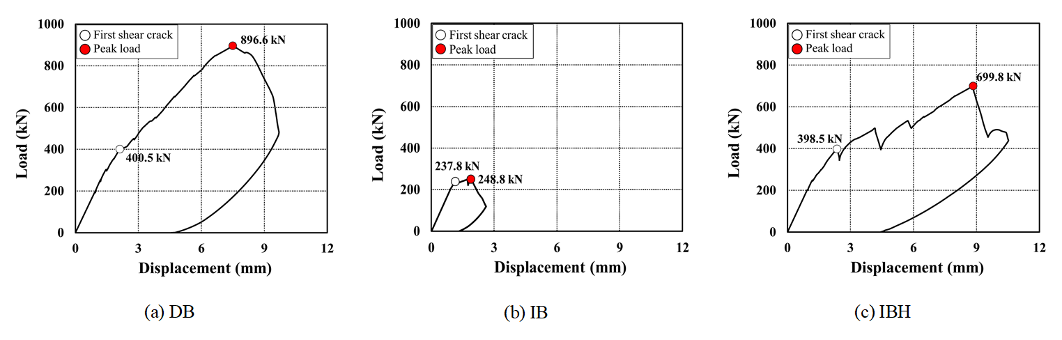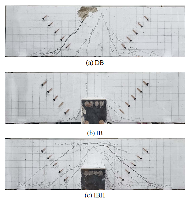 큰 보로 향하는 경사진 균열이 확인되었다. IB 실험체는 248.8 kN에서 최대하중에 도달하였으며, 이는 DB 실험체 최대하중의 27.7%에 해당된다.