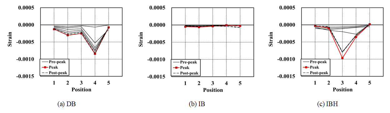 영역의 대각 중심 하부(4번 위치)에서 최대 압축변형률을 보였다. 반면 행거보강근 없이 하부 간접하중을 받는 IB 실험체는 작은 보 가력점에서 큰