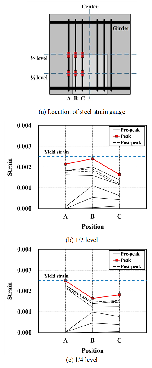 보강근의 최고 변형률은 각각 0.0025, 0.0024, 0.0018로 계측되었다. 이는 앞서 기술하였듯이 행거보강근이 하부간접하중을 큰 보 상부로
