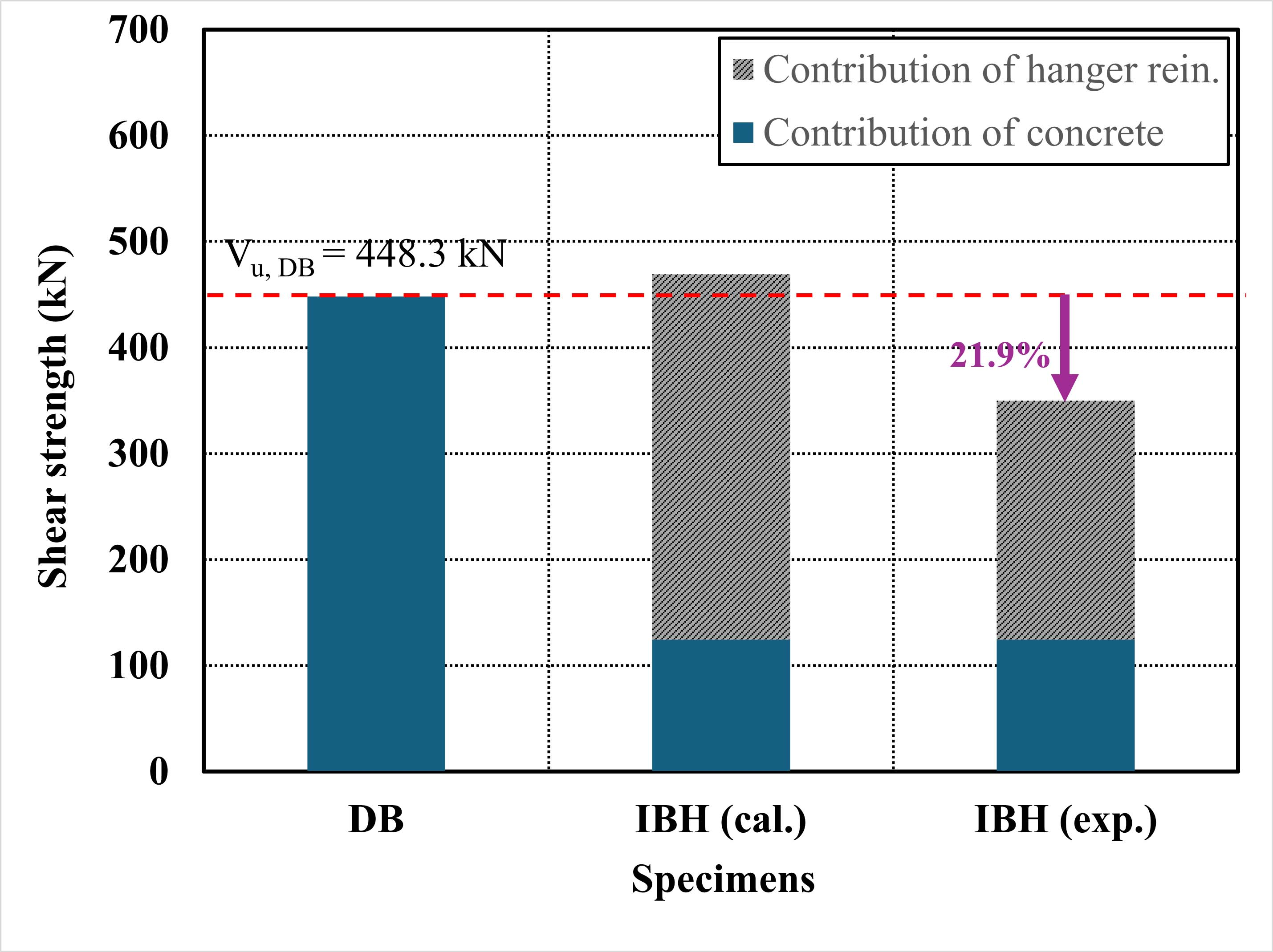 하부간접하중을 받는 실험체에서, 전단강도에 대한 콘크리트의 기여분은 IB 실험체의 전단강도인 124.4 kN과 같다. 직접하중을 받는 DB 실험체의