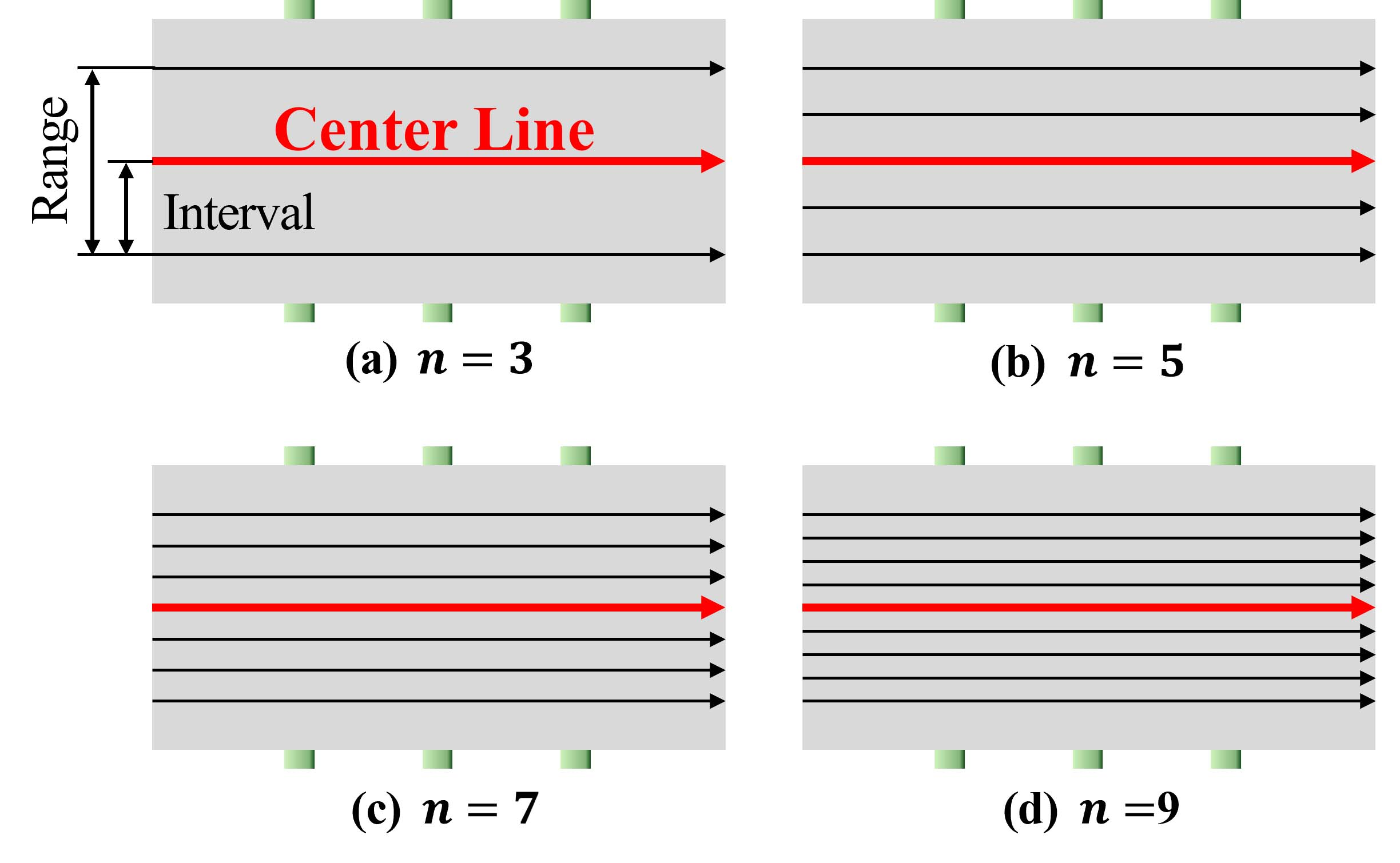 140 mm)이다. 모든 B-Scan 데이터는 중심선을 기준으로 각 측정 횟수에 따라 등간격으로 수집되었다. 여기서 간격(Interval)은 측정