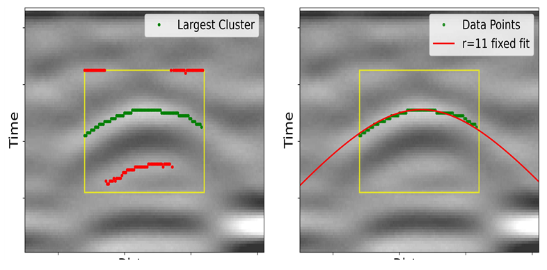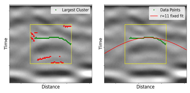 형성된 클러스터 중 가장 큰 것을 실제 쌍곡선 정보로 간주하였으며, 해당 클러스터에 포함된 데이터 포인트를 기준으로 쌍곡선 회귀분석을 수행하였다(Fig. 7(d)). 최종적으로, 쌍곡선 회귀분석 결과를 이용하여 $v$ 와 $t_{o}$ 값을 추정하였다.
