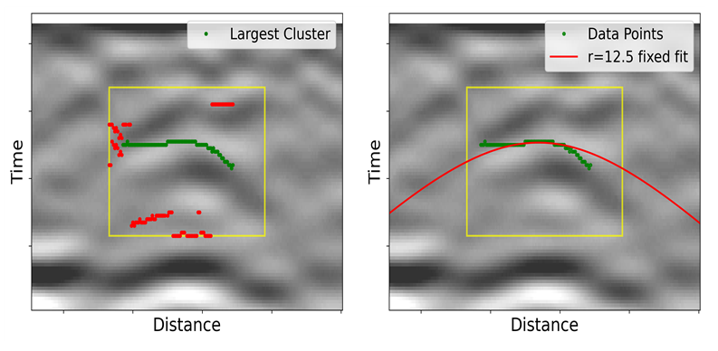 매개변수 $t_{0}$, $r$, $v$에 대해 회귀분석을 진행하면 매설 물체의 매설 깊이를 추정 가능하다(Mechbal and Khamlichi, 2017). 단, $r$과 $v$는 상호 종속적인 관계로 특정한 조건 없이 해를 구할 경우 무수히 많은 해가 존재한다. 따라서 본 연구에서는 $r$을 사용된