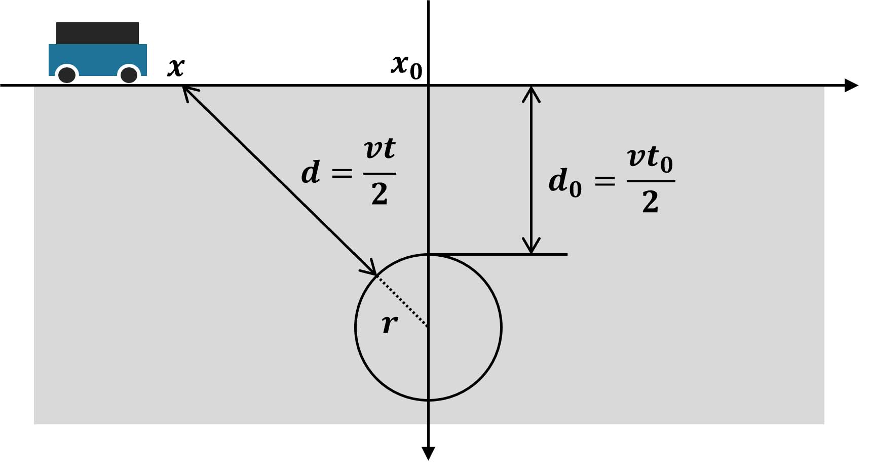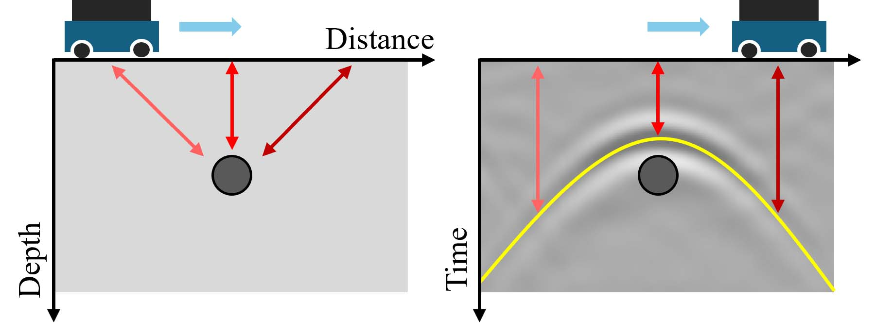 여기서, $x$는 임의의 관측 지점, $x_{o}$는 매설물로부터 GPR 장비가 최소 거리일 때의 위치(매설 깊이), $v$는 매질 내에서 전자기파의