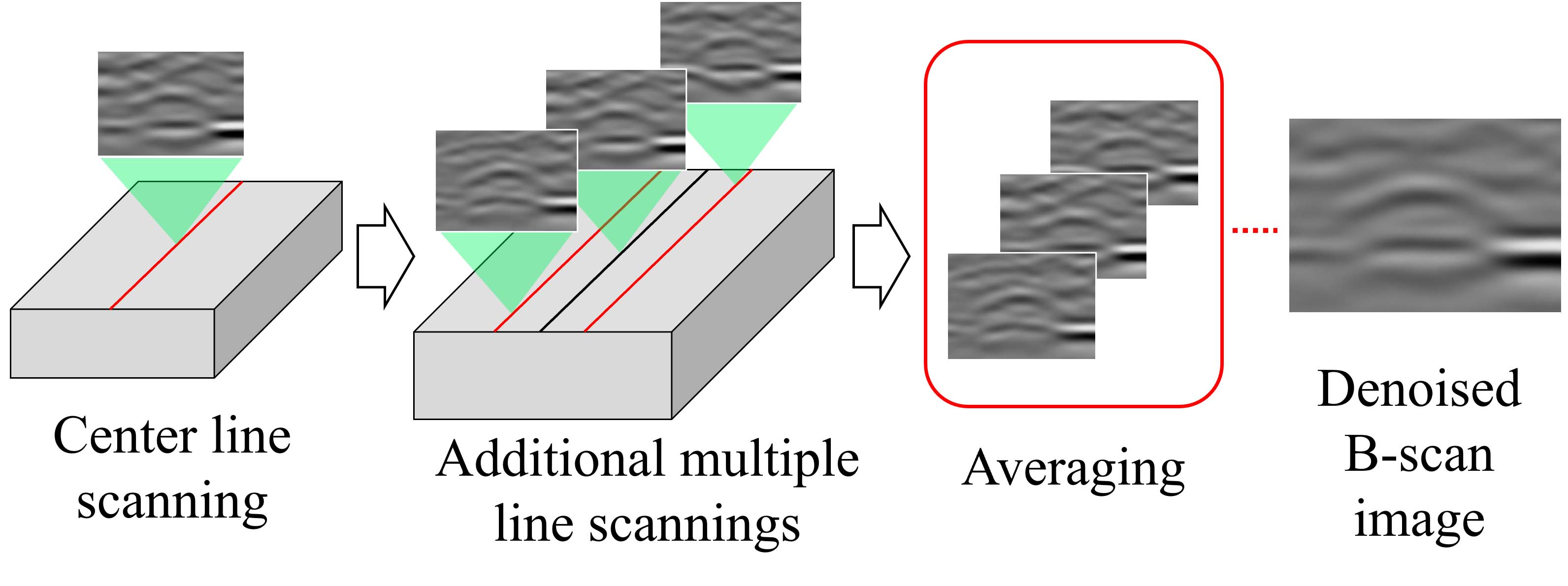 이미지들을 획득한다. 이후 획득된 여러 장의 B-Scan 이미지를 결합(평균)하면 잡음 수준이 개선된 한 장의 B-Scan 이미지가 완성된다. 여기서,