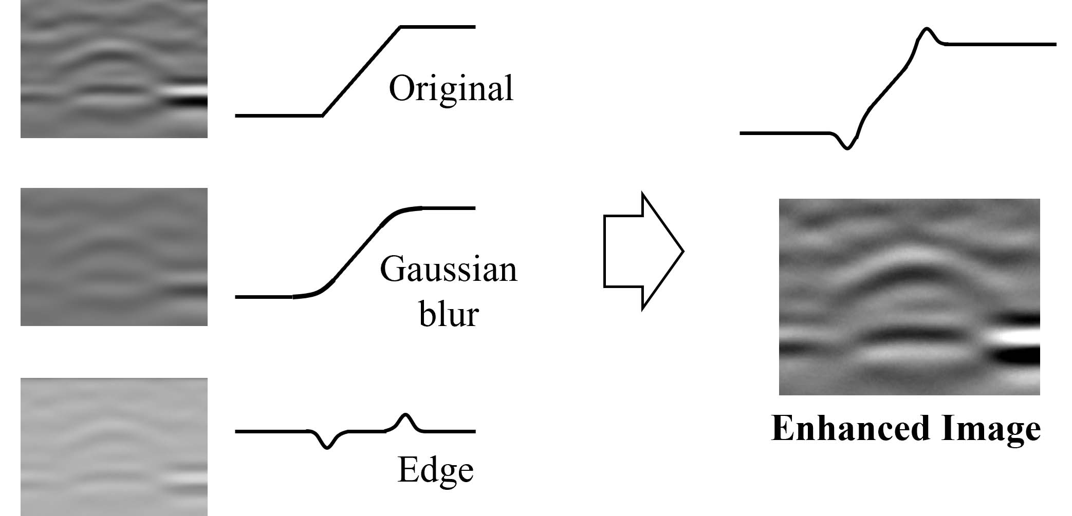 쌍곡선 파형을 보다 선명하게 하기 위한 추가적인 전처리 작업으로는 Unsharp Masking 기법을 적용하였다(Song et al., 2022). 원본 B-Scan 이미지에서 Gaussian Blur를 적용해 흐릿한 이미지를 생성한 뒤, 원본 이미지에서 Blur 이미지를 빼면 Edge 정보만