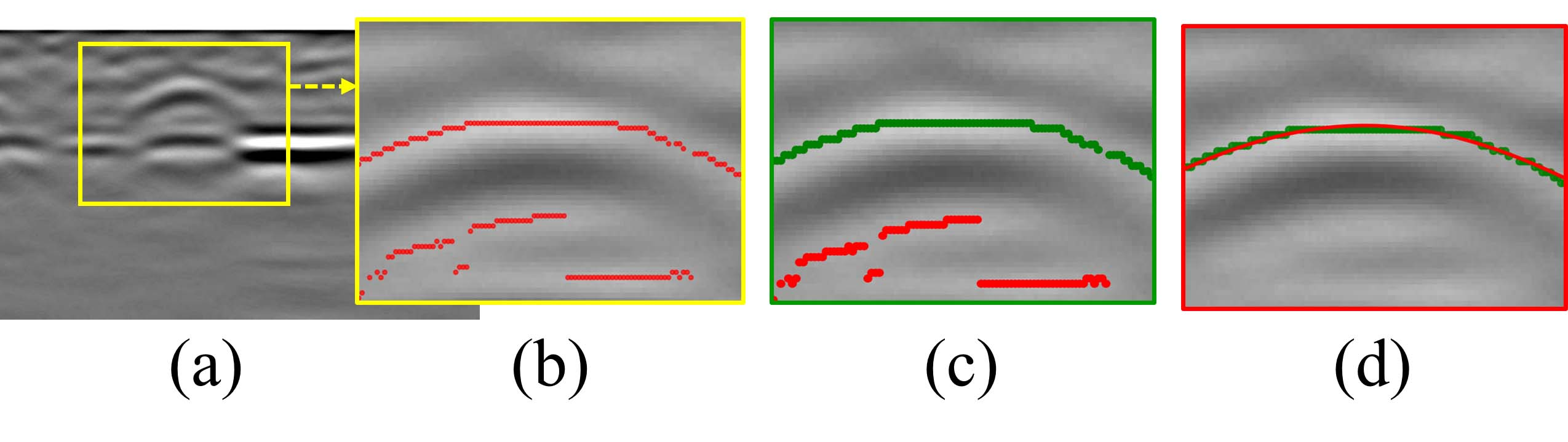 Fig. 12(c)의 이미지를 기준으로 쌍곡선 회귀분석을 진행하여 GFRP 보강근의 매설 깊이를 추정하였다. 지름 19 mm 보강근의 경우 잡음 제거 이후에도 쌍곡선