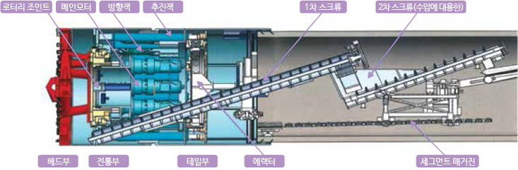 터널은 대구경 회전체인 Cutter Head를 통해 토사 또는 암반 지반을 굴진한다. 이어서 후통부에 위치한 Erector에 의해 구조체로서 역할이