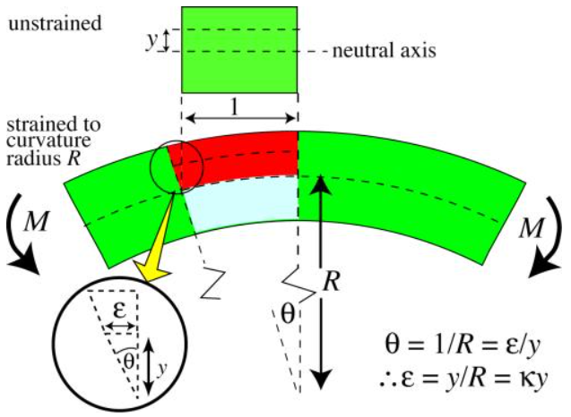 Fig. 12. Relation between the radius of curvature, R, beam curvature, κ, and the strains within a beam subjected to a bending moment