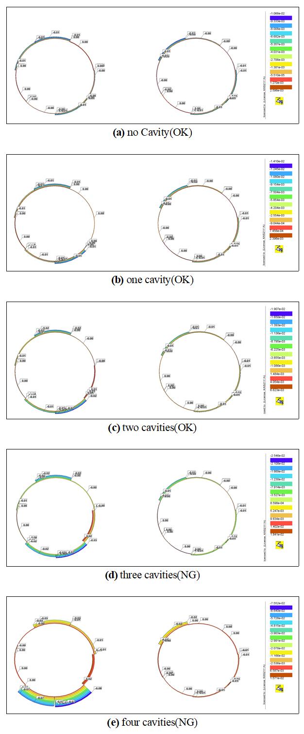 검토시 회전각이 크게 발생한 위치와 유사한 경향을 나타내는 것을 확인할 수 있었다. 특히 공동이 4개 발생한 경우 회전각이 급격히 증가함과 동시에