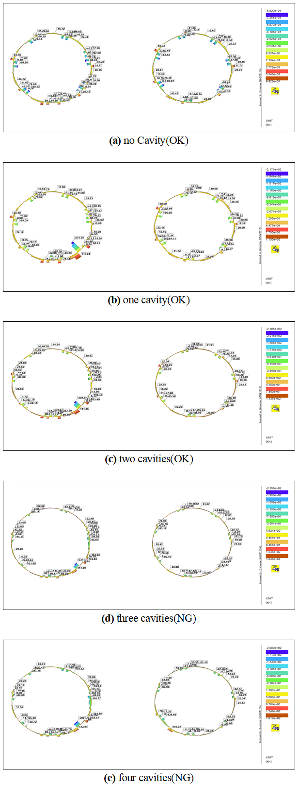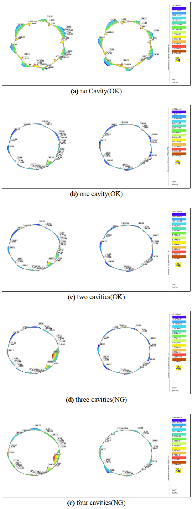 최대 휨모멘트가 공동이 4개 발생한 터널에서 128.4 kN⋅m, 축력은 공동이 3개 발생한 터널에서 2120.8 kN, 전단력은 공동이 2개 발생한