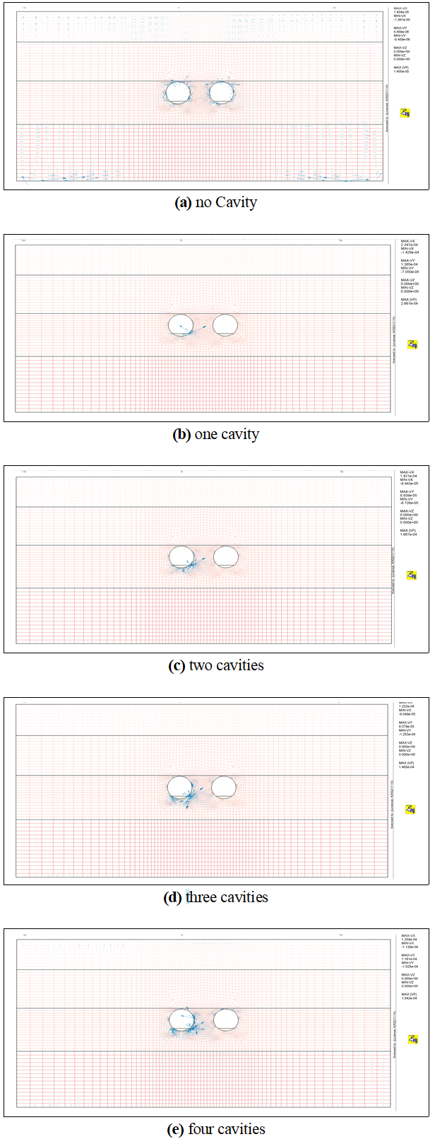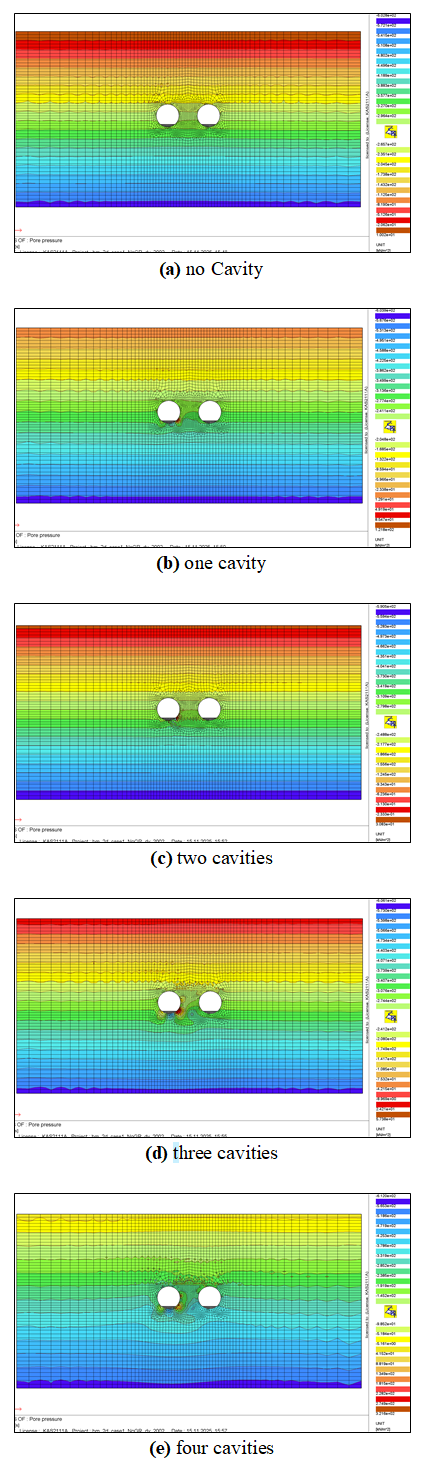 3개 이상이 되면 터널 천단부와 측벽부에서 유속벡터가 집중되는 경향을 보였으며, 일부 공동 상부 지층에서 간극수압이 급격히 소산되는 양상이 나타났다.