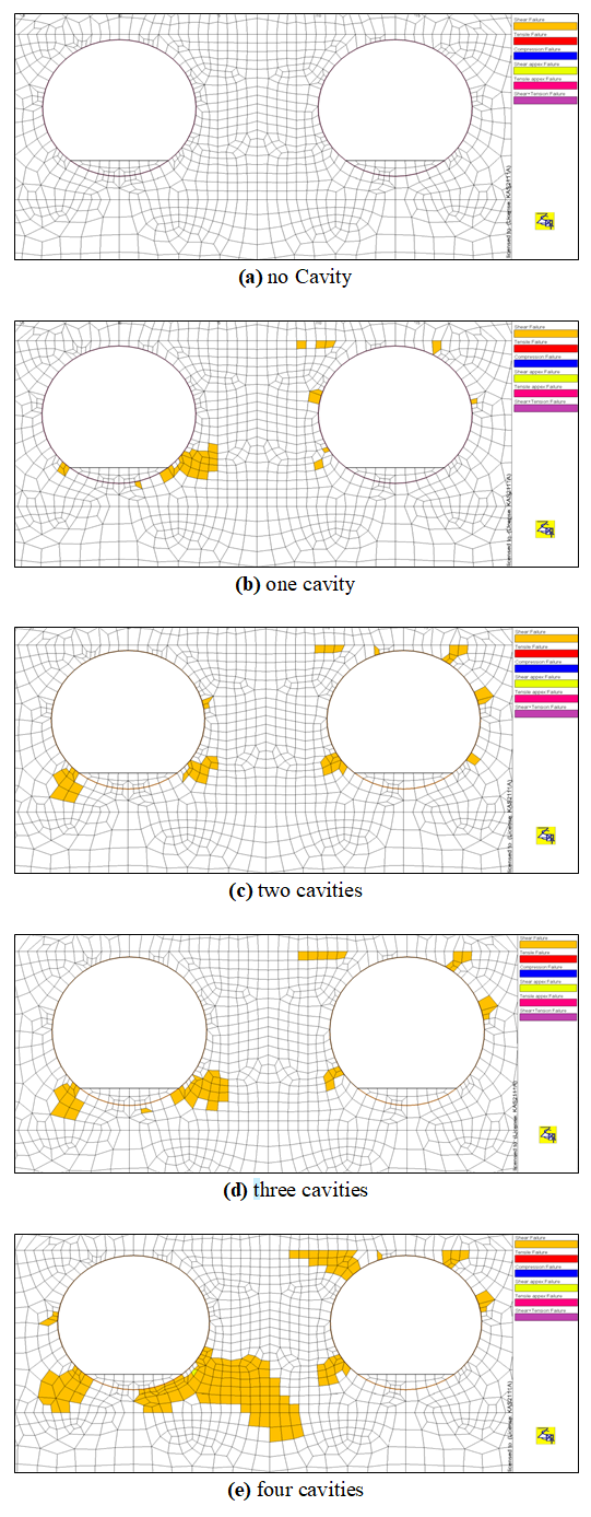 공동이 발생하는 5단계에서 소성영역 검토 결과(Fig. 19) 공동 개수가 늘어날수록 좌터널 공동 주위 및 터널 하단부, 우터널 천단부로 소성영역이 크게 발생하는 것을 확인할 수 있으며, 이는 라이닝 회전각