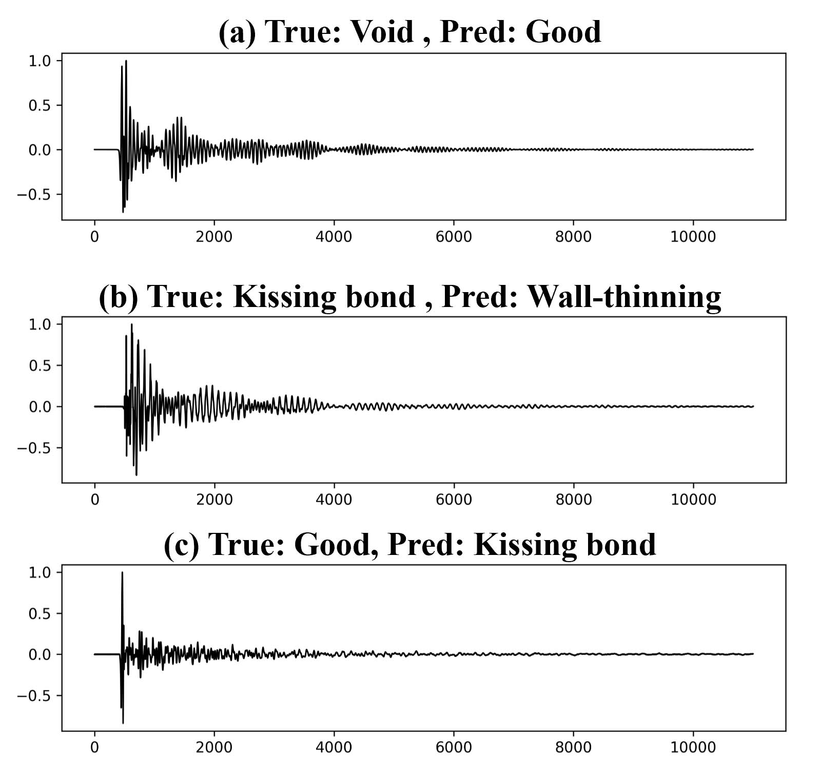 Fig. 12은 제안된 모델의 오분류 사례를 보여준다. Fig. 12(a)는 Void 데이터를 Good으로 예측한 경우로, 실제 신호는 Good보다 Void 특성과 더 유사하다. Fig. 12(b)는 Kissing bond를 Wall-thinning으로 잘못 분류했으나, 신호 패턴은 Wall-thinning보다 Kissing bond에 가깝다.