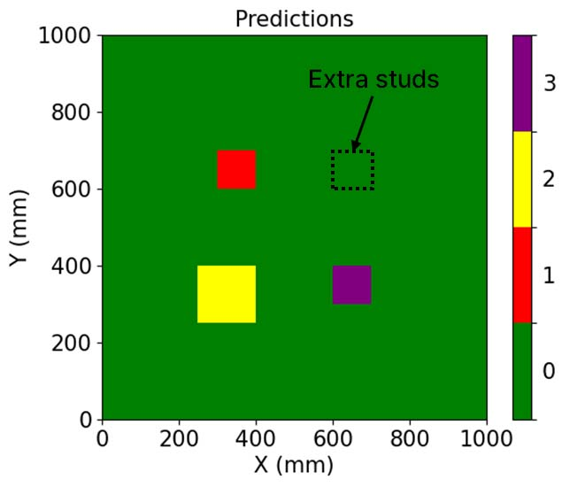 위치와 일치하게 나타났으며, 스터드 영역은 건전 영역과 동일하게 class 0으로 분류되는 것을 확인하였다.