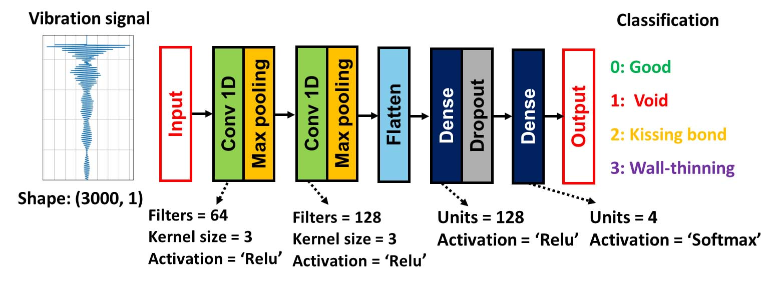 본 연구에서는 충격-응답 기법으로 획득한 진동 신호를 기반으로 CLP 배면 결함을 자동 검출하고 유형을 분류하기 위해 머신러닝 기법을 적용하였다(Jeong, H.-P., 2024; (Cha, Y.-J., et al., 2017). 이를 위해 제작된 시험체에서 수집한 진동 데이터를 학습 데이터로 활용하였으며 모델은 1차원 합성곱 신경망(1-D convolutional Neural