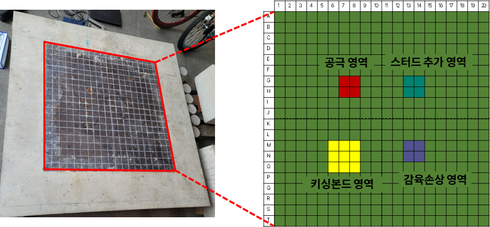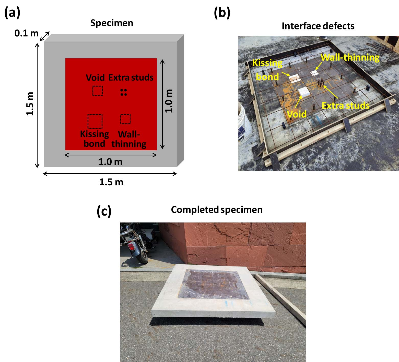 충격-응답 신호 기반 결함 검출 성능을 평가하기 위해 CLP 배면 결함을 모사한 시험체를 제작하였다. 시험체는 1 m x 1 m x 0.006 m의