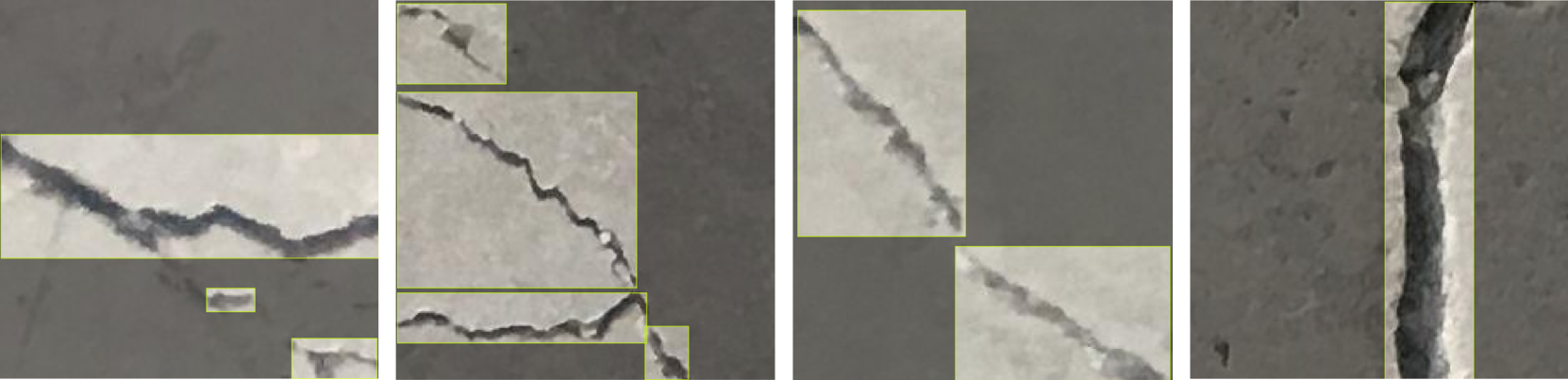 실험에는 구조물 표면의 균열 이미지로 구성된 데이터셋(Fig. 1)인 Public crack detection dataset (NTU, 2023)이 사용되었다. 실험에 활용된 균열 이미지는 콘크리트 구조물 탐지를 위한 이미지 데이터셋으로, 다양한 균열 패턴을 포함하고 있으며, Mosaic 데이터