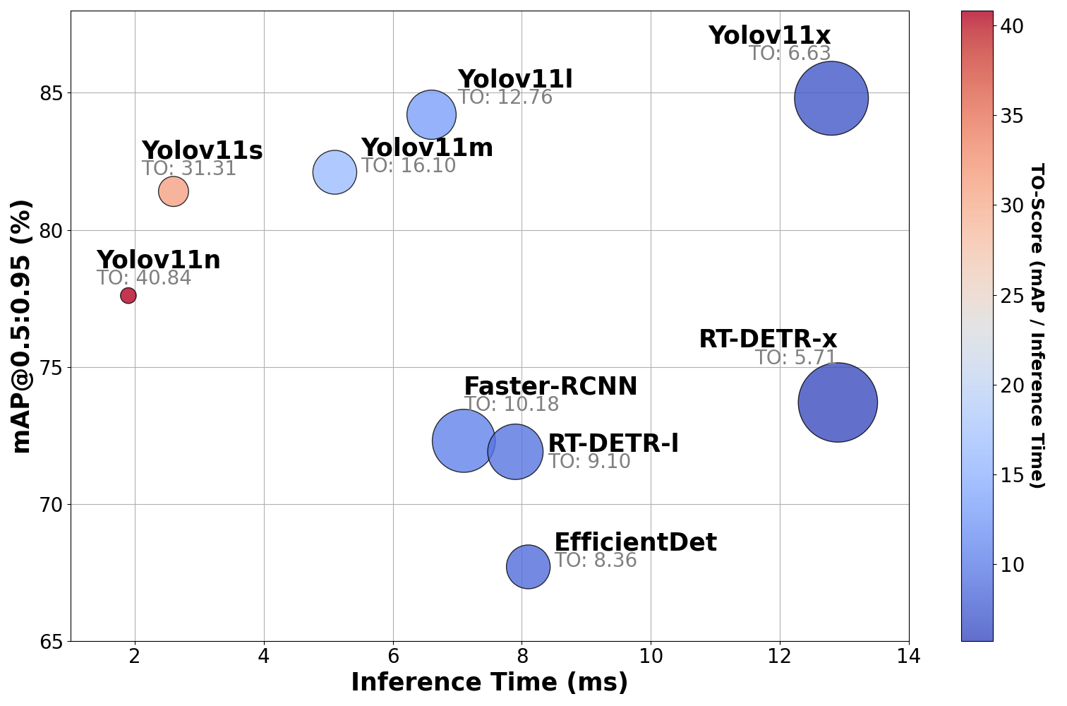 예를 들어, Yolov11x는 84.8%의 정확도를 보였음에도 불구하고 TO-score는 6.63에 그쳤다.