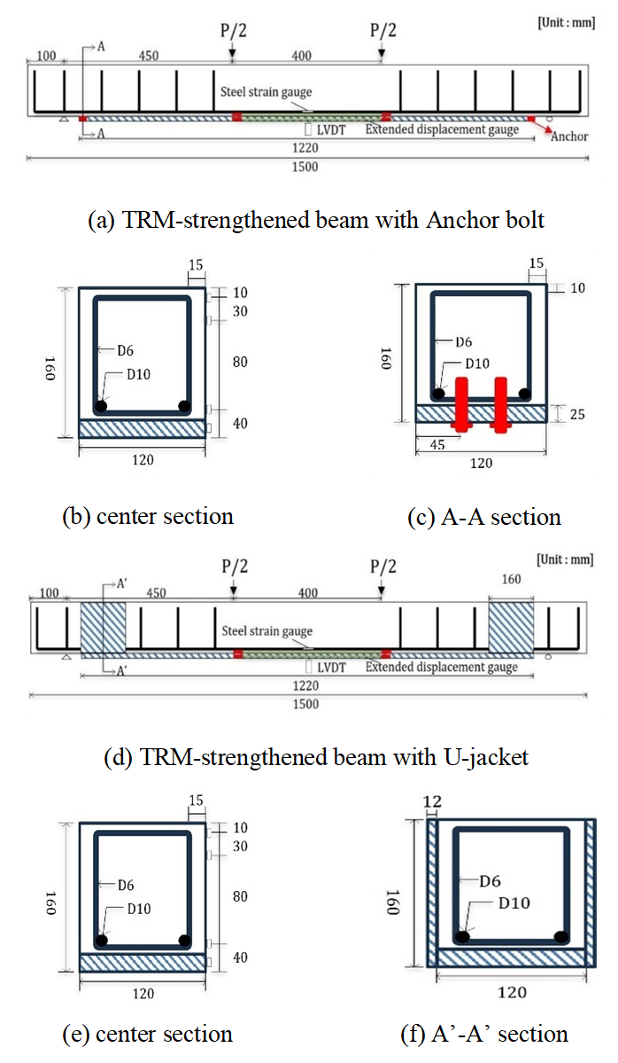 2) 앵커 볼트 및 U-자켓 정착은 계면박리를 예방할 수 있으며, 균열이 없는 철근콘크리트 보에 TRM으로 보강할 경우, 앵커 볼트 정착 TRM 보강보의