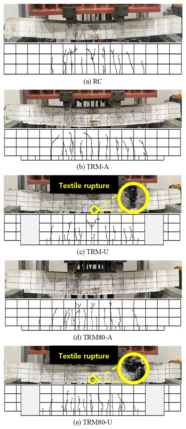 U-자켓 정착 TRM 보강보는 무정착 TRM 보강보 대비 휨 보강 성능은 7%~10% 증가했고, TRM 보강재의 계면박리를 예방할 수 있었지만, 텍스타일의