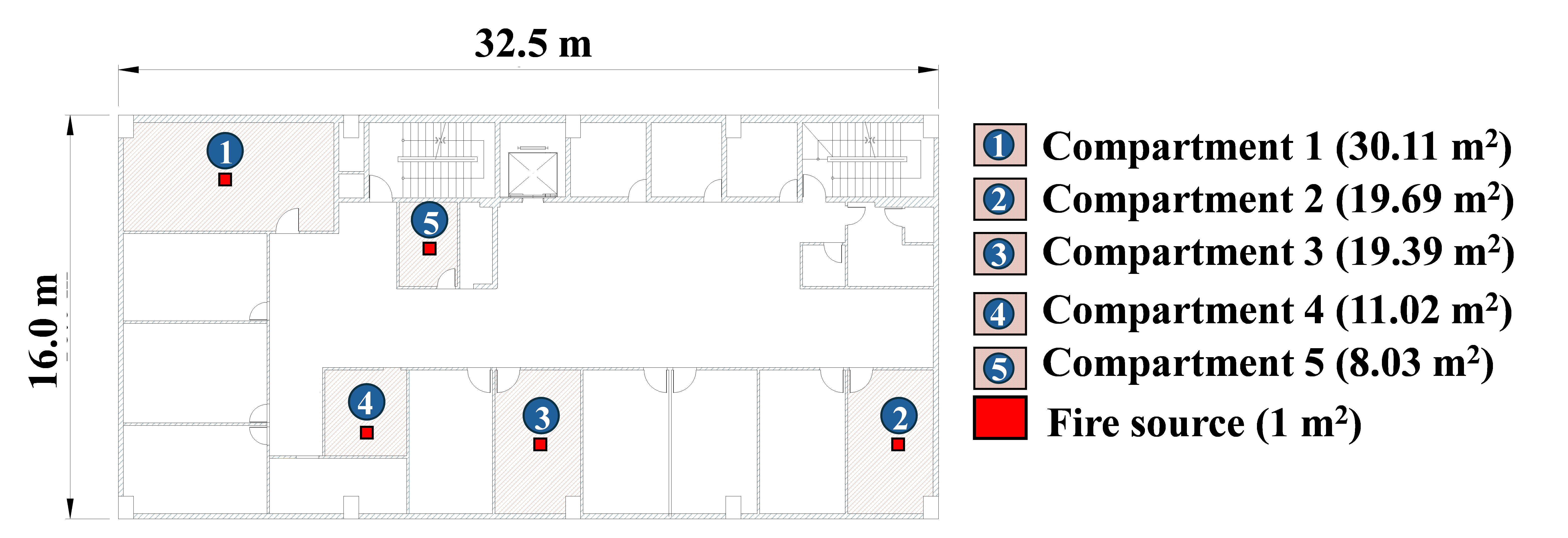 내부 온도가 가장 높게 상승하는 최악의 시나리오(Worst-case Scenario)를 모사하기 위한 것이다. Fig. 1에 나타낸 바와 같이 구획실 1부터 5까지의 바닥면적은 각각 30.11 m2, 19.69 m2, 19.39 m2, 11.02 m2, 8.03 m2이다. 연료는 각 구획실의 일반적인 가연물 구성을 고려하여 대표적으로 Flexible PolyUrethane Foam-GM23 (FPUF-GM23),