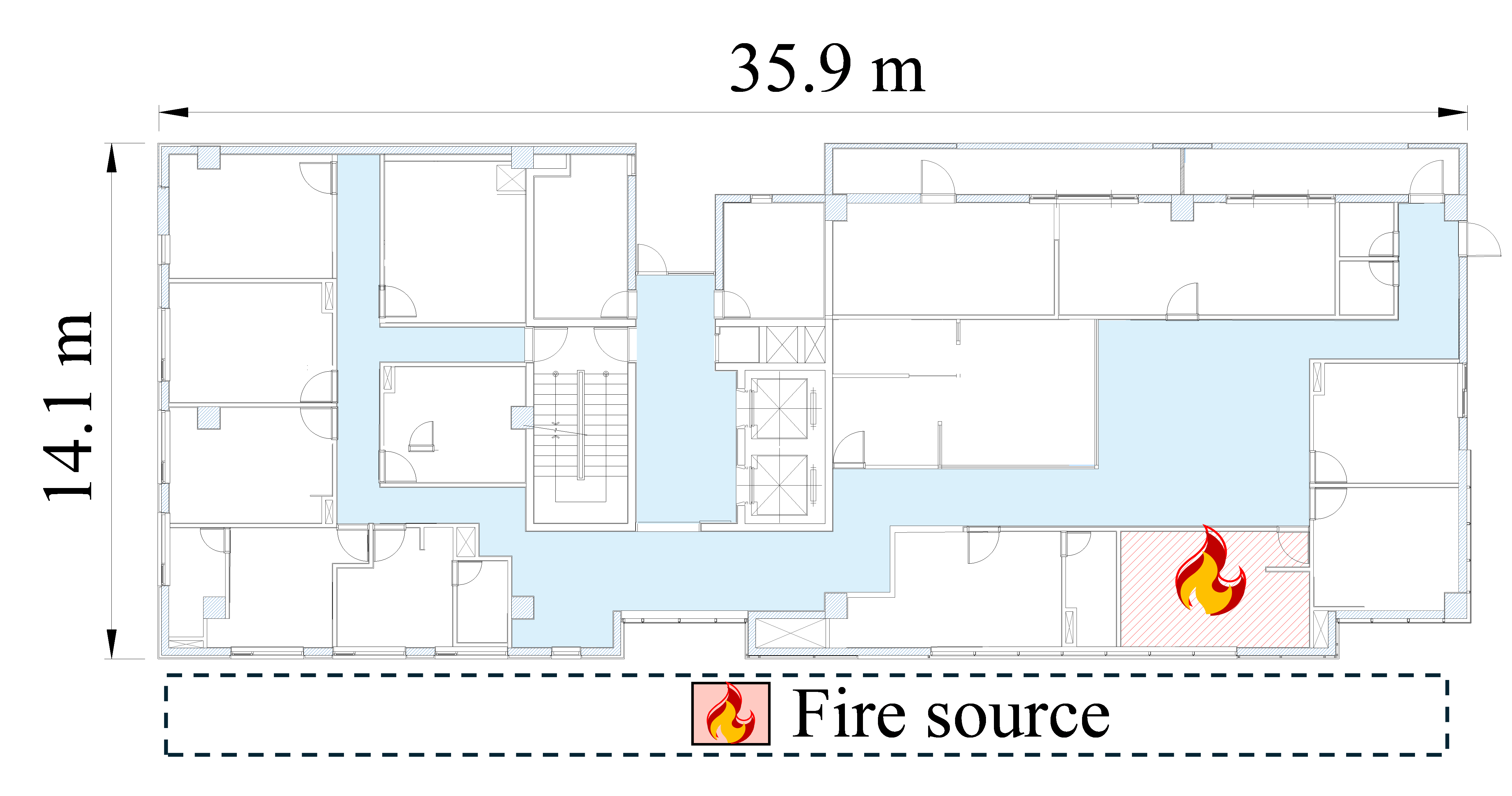FDS 모델링이 업무시설의 화재 성상을 물리적으로 적절하게 모사하고 있음을 확인하였다. Fig. 1에 나타낸 바와 같이 화재 시뮬레이션 대상 건축물은 10층 이하 업무시설로 가정하였으며, 바닥면적이 약 520 m2(16.0 m x 32.5 m) 규모의 평면도를 적용하였다. 이때 대상 건축물은 10층 이하의 업무시설로 가정하였으며, 이는 층 전체가 단일 방화구획