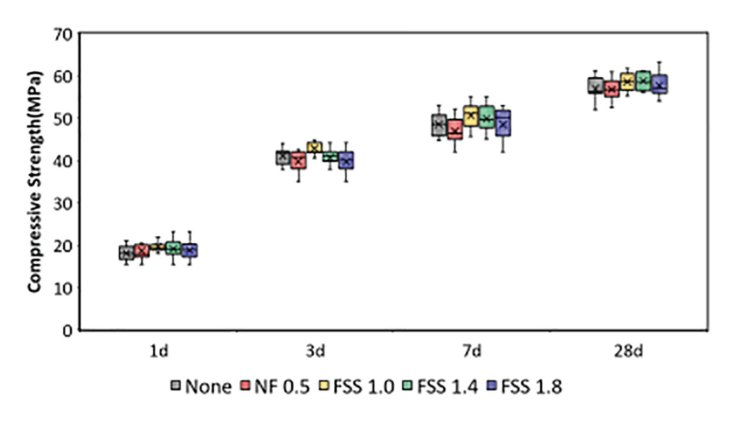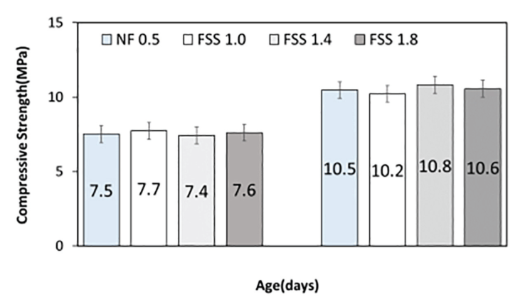 ์์ถ๊ฐ๋ ์ธก์ ๊ฒฐ๊ณผ, NF0.5๋ ์ฌ๋ น 7์ผ์์ 7.5 ยฑ 0.5 MPa, ์ฌ๋ น 28์ผ์์ 10.5 ยฑ 0.5 MPa๋ก ๋ํ๋ฌ์ผ๋ฉฐ, FSS1.0์