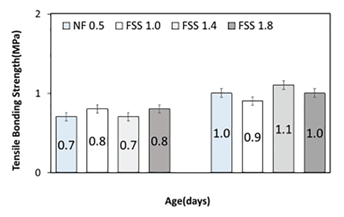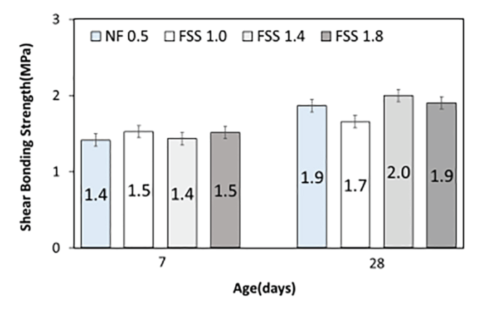 ์ ๋จ์ ์ฐฉ๊ฐ๋ ์ธก์ ๊ฒฐ๊ณผ, NF0.5๋ ์ฌ๋ น 7์ผ์์ 1.4 ยฑ 0.1 MPa, ์ฌ๋ น 28์ผ์์ 1.9 ยฑ 0.3 MPa๋ก ๋ํ๋ฌ์ผ๋ฉฐ, FSS1.0์