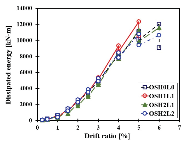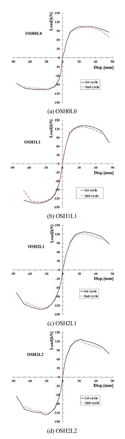 변위비 이후에 겹침이음이 적용된 실험체(OSH1L1, OSH2L1, OSH2L2)에서 OSH0L0 실험체보다 증가되는 경향을 나타내었다.