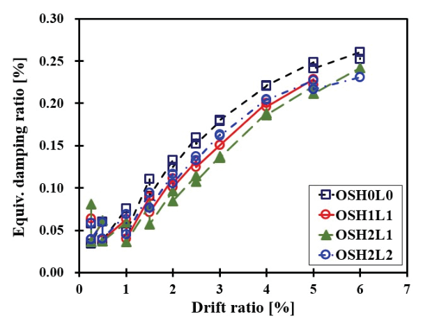 OSH0L0 실험체보다 OSH1L1, OSH2L1, OSH2L2 실험체의 등가점성감쇠비가 낮게 분석되었고 변위비 4%에서 0.88∼0.91의 범위를