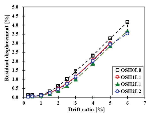 4.0% 변위비 단계에서 OSH0L0 실험체의 잔류변형 보다 0.92, 0.86, 0.90 만큼 낮게 분석되었다.