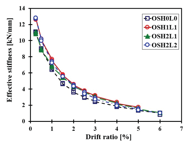 증가된 실험체(OSH1L1, OSH2L1, OSH2L2)는 OSH0L0 실험체보다 잔류변형이 감소하는 경향을 나타내었다. 누적 유효강성은 0.75%