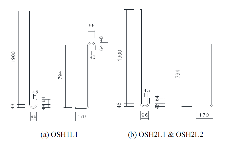 OSH1L1 실험체의 경우, Fig. 2(a)에 나타낸 바와 같은 축방향철근 상세가 적용되었다. Fig. 2(a)의 좌측 철근은 기둥 전체에 적용되었고 Fig. 2(a)의 우측 철근은 기초저면부터 기둥 소성힌지부에 배근되었으며 기둥에서의 겹침이음 길이는 280 mm이다. KDS 14 20 52 및 ACI318에 표준갈고리를