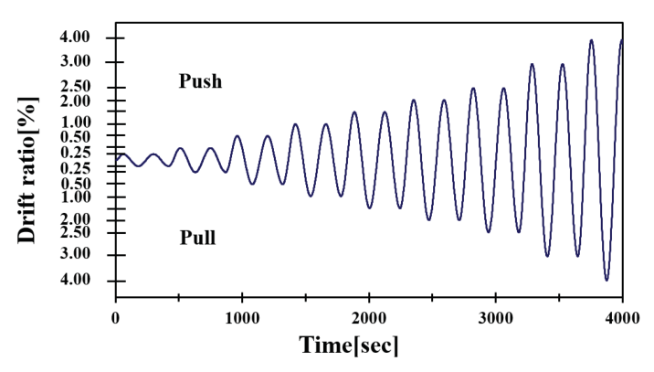 이용하여 실험대에 고정하였다. 유압잭을 적용하여 축력을 재하 하였고 횡방향 하중을 재하하는 준정적 실험을 수행하였다. 하중재하 방식은 Fig. 3에 나타낸 바와 같은 변위제어 방식이 적용되었고 축방향철근이 파단되는 변위까지 진행되었다.