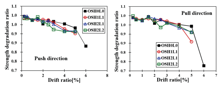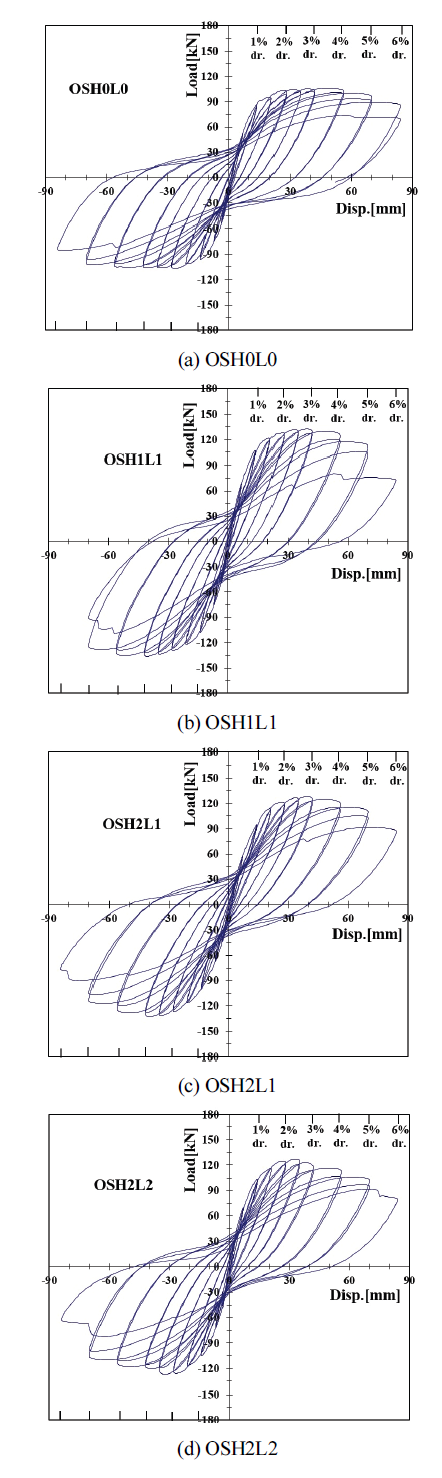 최대 황하중 강도 발현 이후에 횡하중 강도 감소 현상이 OSH0L0 실험체보다 급격하게 나타났다.