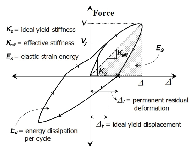 Fig. 9. Definition of dissipated energy, equivalent viscous damping ratio, residual