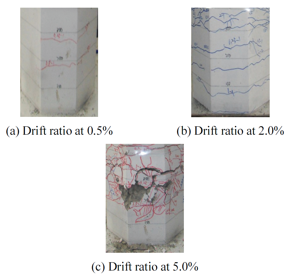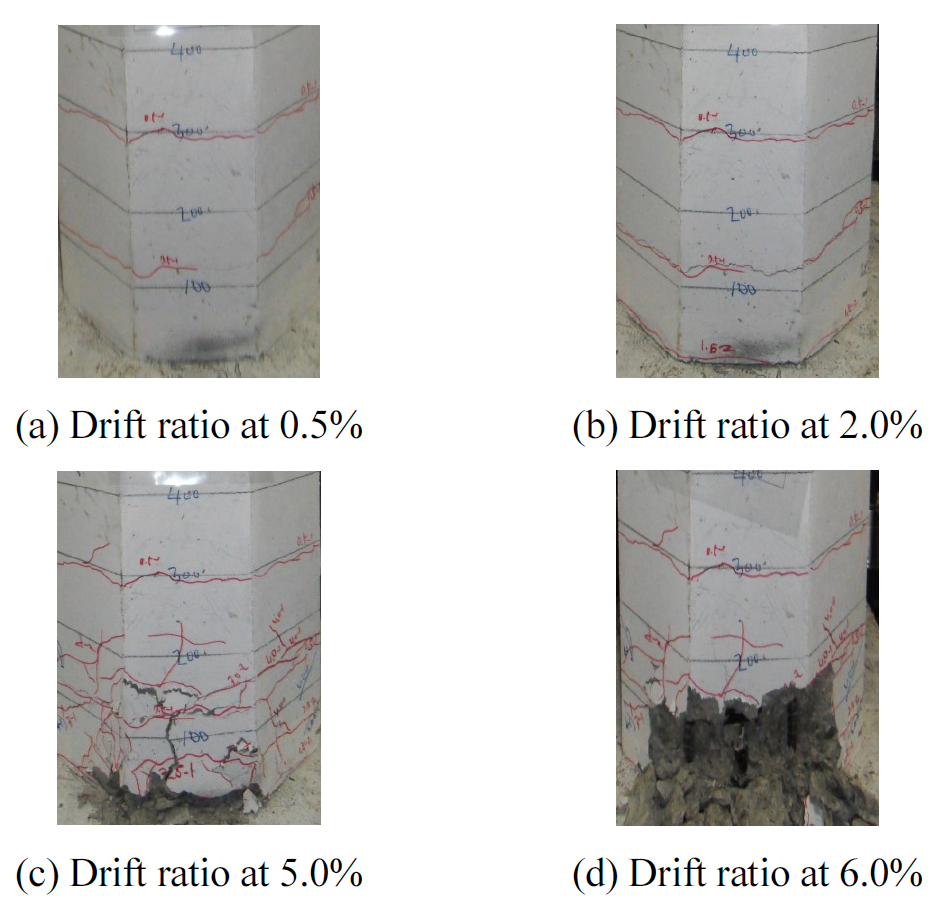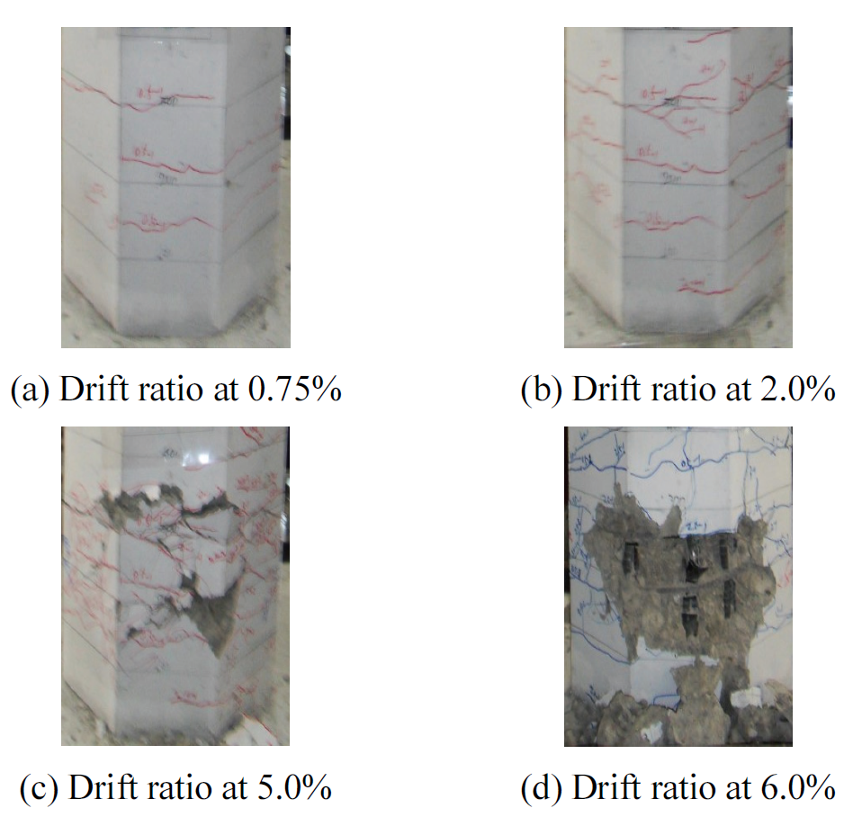 5.0% 단계에서 피복 콘크리트 탈락으로 축방향철근이 노출되었다. 변위비 5.0% 단계에서 콘크리트 파괴가 심화되었고 축방향철근의 파단으로 실험을