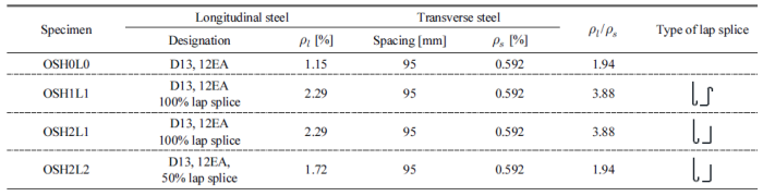 축방향철근비는 2.29%이며 OSH2L2 실험체는 OSH2L1 실험체와 동일한 축방향철근 상세이나 축방향철근 중 50% 겹침이음이 적용되어 축방향철근비는