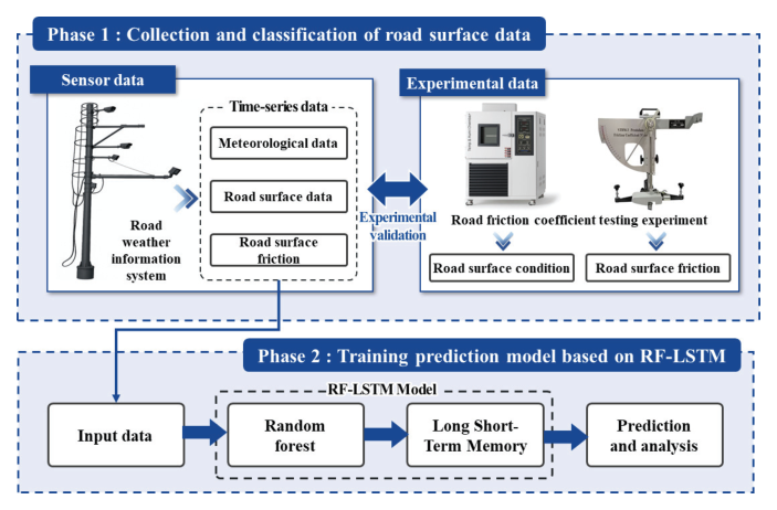 본 연구에서는 도로 노면 상태를 정밀하게 예측하기 위한 프레임워크를 제시하였다. 제시된 프레임워크 절차는 Fig. 1에 보인 바와 같이 두 단계로 구성된다. 첫 번째 단계에서는 학습에 활용할 RWIS 데이터를 수집하고, 실내 실험으로 구현된 노면 상태별 데이터를
