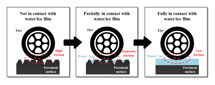 수막이나 빙막이 형성될수록 타이어와 노면 간의 마찰 저항이 감소한다. Fig. 2는 이러한 노면 상태별 마찰 특성의 개념적 변화를 나타낸 것이다. 즉, 마찰계수는 노면의 물리적 특성과 상태 변화를 직접적으로 반영하는 지표로서,