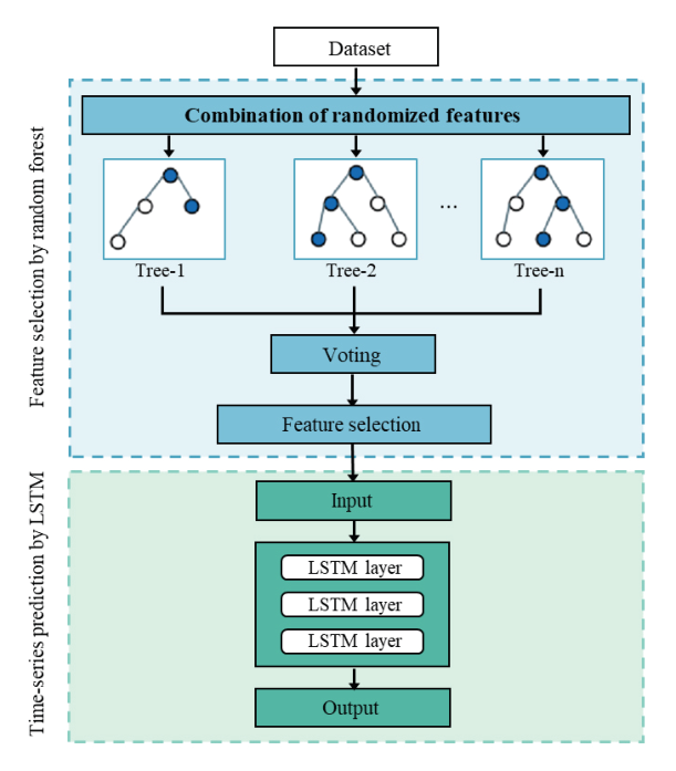 예측하였다. Fig. 3은 제안된 모델의 구조를 나타낸다. RF-LSTM은 RF의 변수 중요도 산출 및 입력 데이터 노이즈 제거 능력과 LSTM의 시간적 패턴 학습 능력을
